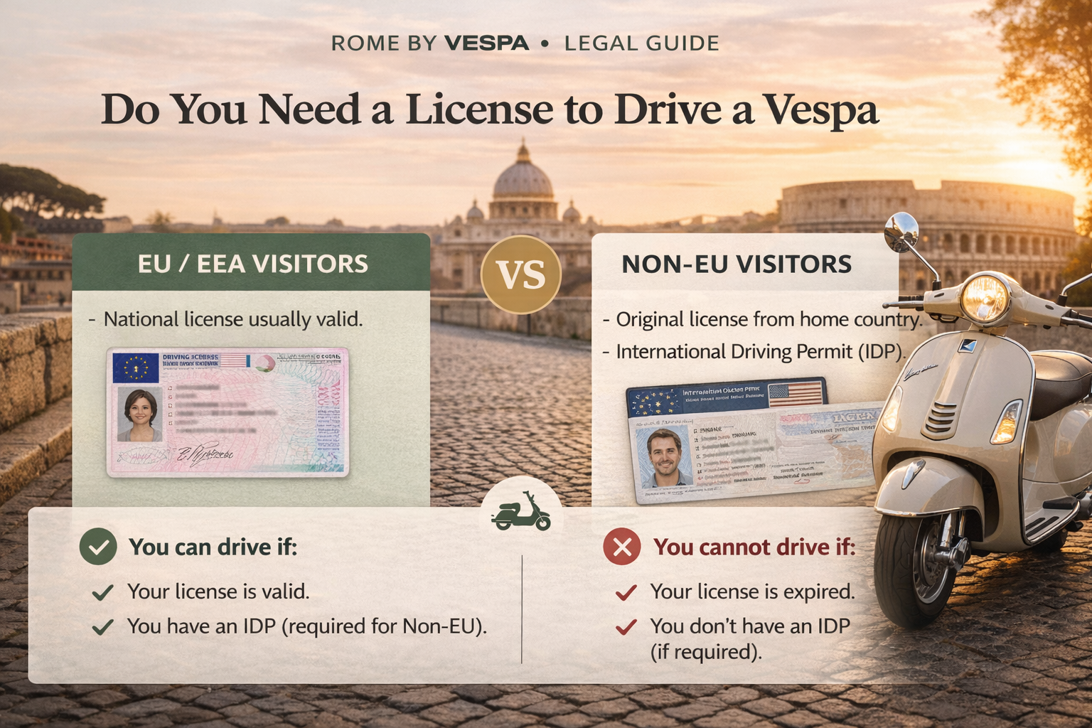 Practical, honest advice from a licensed local guide. This is not a “photo tour” pitch — it’s a clear guide to help you choose the right Vespa experience in Rome: self-drive (experienced riders only) or passenger (maximum comfort).